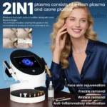 The plasma beauty 2-in-1 machine consists of an instant plasma and a plasma.Gold fist function one of a flash plasma: facial lifting and hardening, removing stains and wrinkles.White fist function two of an ozone plasma:Anti-inflammatory sterilization, soothing and itching, metabolic Pigment, regulating the secretion of oil controlling oil control and skin cleaning. Seven different test points can be replaced by allergic skin, acne, eczema, dermatitis and other skin.