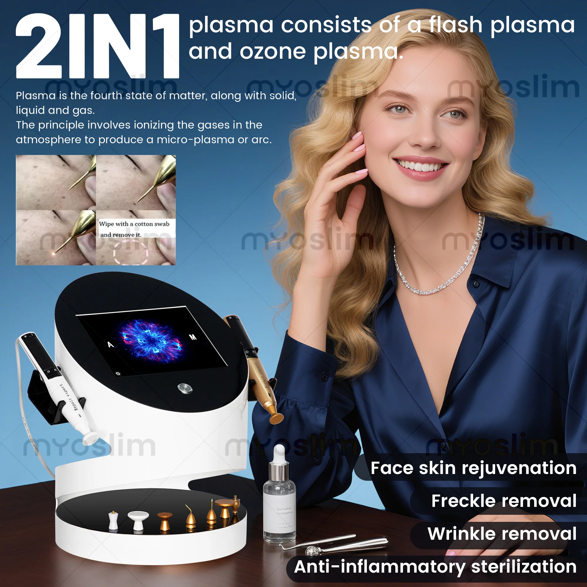 Plasma is composed of ions and electrons and is an ionised gas with electric energy. Space plasma releases electrical energy, using plasma conduction technology to open the principle of the mucous membrane of skin cells, inducing and altering the position of the ion, allowing them to freely pass through the cell membrane. When cell membrane tension increases, it helps cells produce tension, so that cation displacements on the medial and lateral sides of the cell membrane are corrected, the potential of the membrane returns to a state of equilibrium, the cells return to normal operation, the skin regenerates, and the skin tissue resistance is increased. Effectively improve the surface of the skin in the treatment of acne, scars by not destroying cells, with skin rejuvenation, sterilisation, antibacterial, anti-inflammatory, whitening, improving skin flaccidity and other effects.